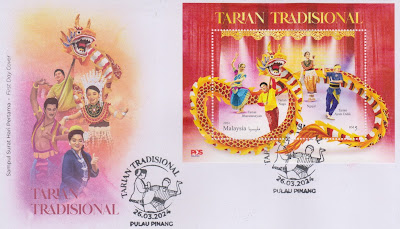Created these First Day Covers at Pulau Pinang Main Post Office (aka George Town General Post Office). Four setenant stamps of RM1.30 vaule depicting the Chinese Dragon Dance, Indian Bharatanatyam Dance, Iban Ngajat or Women's Dance and Malay Ayam Didik Dance and a miniature sheet of RM5 combining all four dances.
